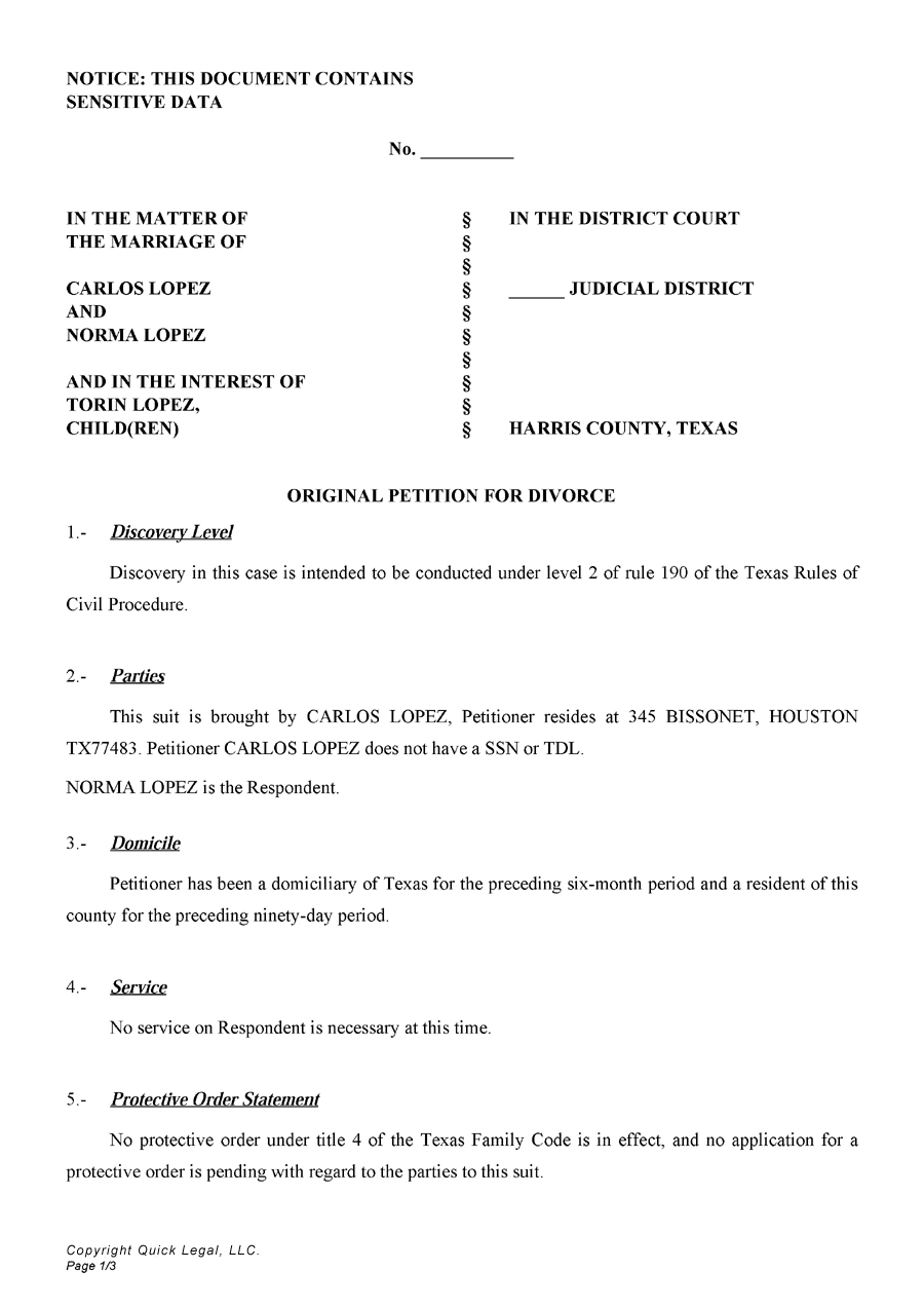 We at Quick Legal, LLC., are pleased that you interested in the divorce products offered by this site. Whether you are seeking a divorce with children or a divorce without children, this site will provide you with access to the law related to obtaining a divorce, so that you can be informed what the requirements are for a Divorce in Texas. Please check the, Texas Family Code if needed.